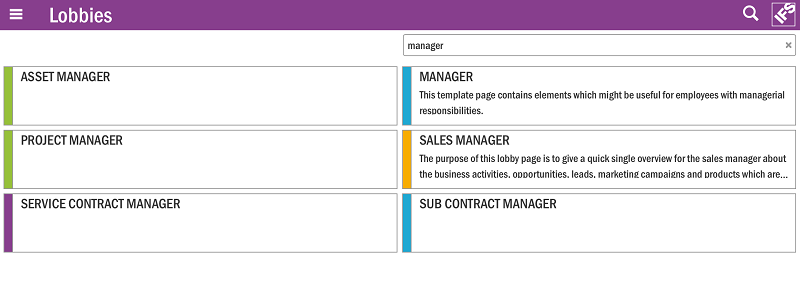 The Lobbies page contains a list of all existing Lobby pages. Clicking the search icon available at the upper right hand corner will open up the search filter. Use this to search for Lobby pages, e.g. type “manager” to search for all pages having “manager” as part of page Title, Name, Author or Keywords.